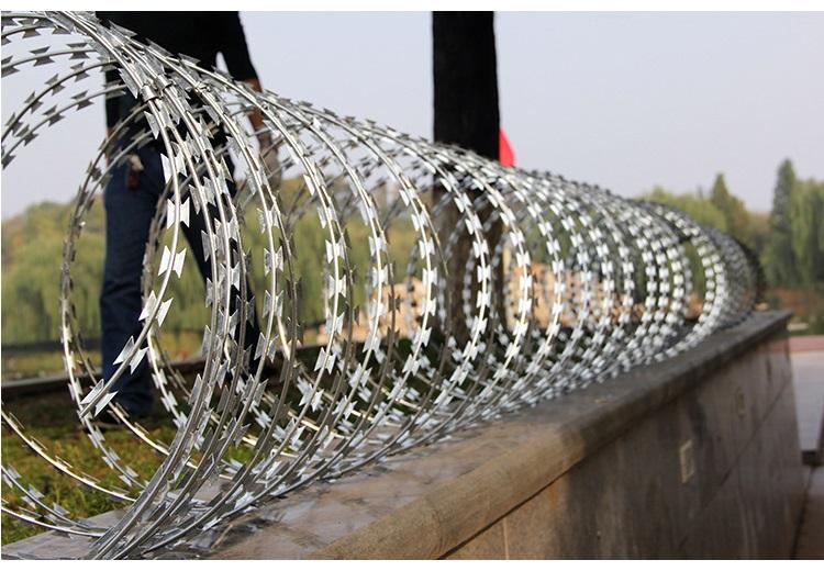 刀片刺絲滾籠 也稱刀片刺絲、刀片刺網,是一種新型護欄網產品 。 刺絲滾籠是在兩條刀片刺網之間以不銹鋼片和鍍鋅鋼片強力夾和,展開后 即呈交叉狀,美觀又實用。 刀片…