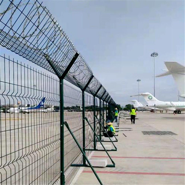 如果在飛機場圍界防護網(wǎng)頂部加裝刀片刺絲、刀片刺網(wǎng)后又很好的增強了安全防護性能。采用電鍍、熱鍍、噴塑、浸塑等防腐形式,具有很好的抗老化、抗曬、耐腐蝕等特點。其產(chǎn)品造型美觀、花色多樣,既起到圍欄作用,又起到美化作用。由于具有安全性高、防攀爬能力好,網(wǎng)片連接方式采用特制SBS緊扣件,有效防止人為的破壞性拆卸,橫向四道折彎加強筋,使網(wǎng)面強度顯著增加。