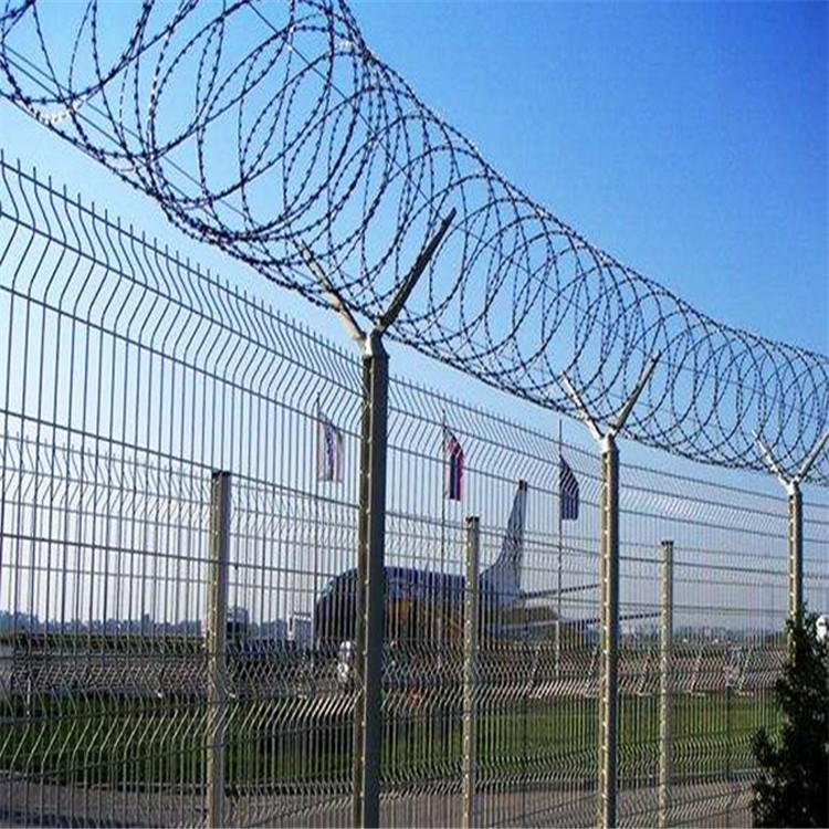 飛機圍界是做什么的?飛機圍界是機場邊界的重要保護措施,是為防止人為破壞,保證機場安全,讓飛機順利起飛的護欄產品,這種護欄網表面采用電鍍、熱鍍、浸塑、噴塑等處理方式,實現顏色多樣多化,在連接方式上采用特制SBS緊扣件,防止人為破壞拆卸,又在網片上加裝橫向四道折彎回強筋,使整體既美觀又實用。,機場圍界根據結構分類,可以分為菱形網圍界和方孔鋼筋網圍界,區別就是二者的生產工藝不同,一種是用勾花網用作網板或斜方孔網片用作網板,另外一種是用鋼筋網片或電焊網片用作網板來制作機場圍界