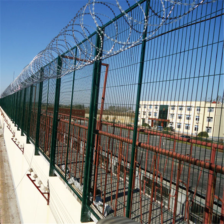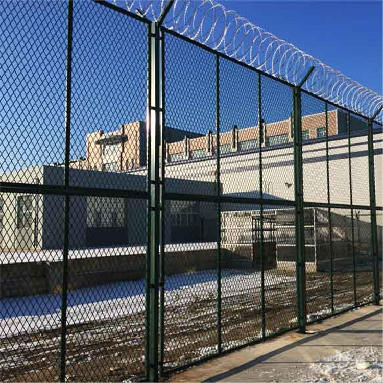 2:監(jiān)獄鋼網(wǎng)墻用在放風場 警戒線內(nèi)就需要做成2.5-5m左右的高度。上部加Y型柱,有效防止犯人的逃脫,因為上部會安裝刀片刺繩,對人也起到恐嚇的作用。
