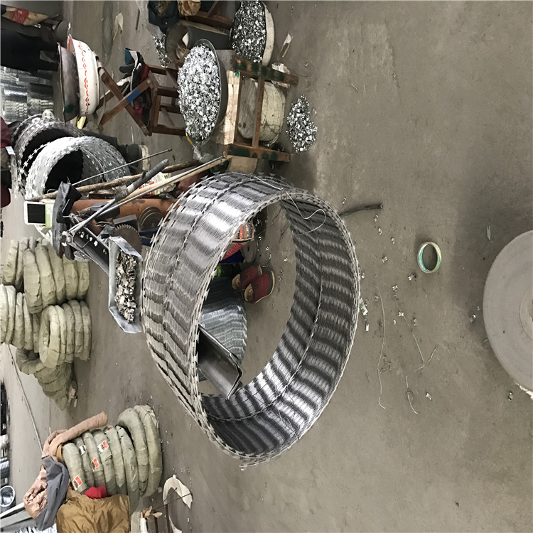 不銹鋼刀片刺繩是一種近年發展起來的防護、隔離能力較強的新型防護網產品。它采用鋼板沖壓成型包附于鋼絲之上,由銳利尖角鍍鋅鋼板或不銹鋼薄板做刀片,高張力鋼絲做芯線組合而成的。常見圈經500mm、600mm、800mm,其它規格也可定制。根據形狀可分為:螺旋式-刀片刺網、交叉式-刀刺網、平板式-刀片刺網、直線式-刀片刺網。被廣泛應用在監獄,機場,軍事基地等高安全場所。