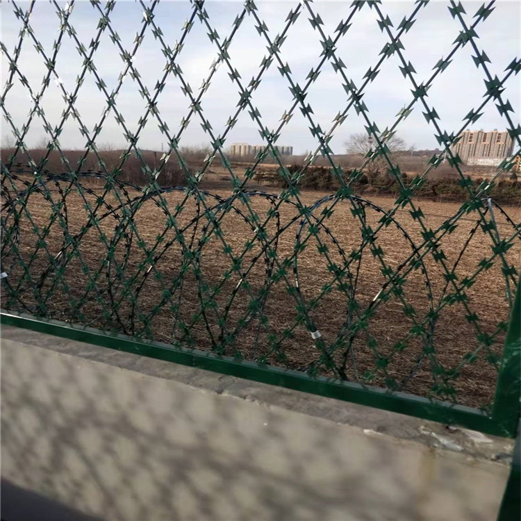 網片外表處理: 鍍鋅,噴塑,噴漆,電泳等?;蛘哂貌讳P鋼304,316等材質刀片刺繩焊接,進而拋光即可。不銹鋼材質的刀片刺網使用壽命都可達到十年以上。