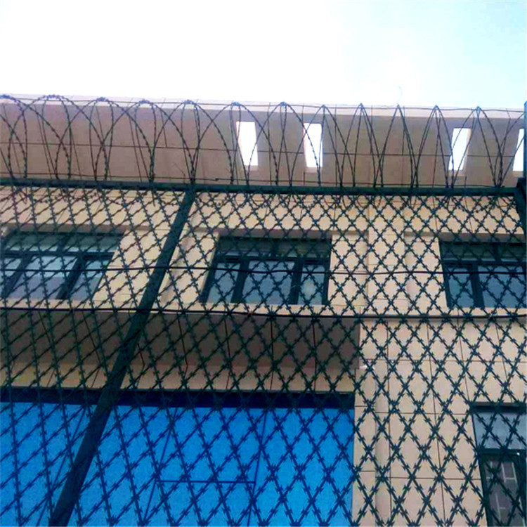 一般都設(shè)有V型支架與立柱焊接。材料通常選擇和立柱同等材料或者稍小規(guī)格材料搭配使用。V型支架的加裝是為了將蛇腹形刀刺網(wǎng)固定在隔離網(wǎng)頂部,從而有效的增加看守所隔離網(wǎng)-哨所隔離網(wǎng)-監(jiān)獄隔離網(wǎng)的防攀爬性和安全性。 看守所隔離網(wǎng)-哨所隔離網(wǎng)-監(jiān)獄隔離網(wǎng)V型支架加裝防拆卸刀刺網(wǎng)。刀刺網(wǎng)的直徑一般為500mm、600mm、800mm,材質(zhì)均為304不銹鋼,鎳含量8個(gè)以上。刺網(wǎng)芯線直徑為2.5mm、刀片長22mm,刀片寬度15mm,刀片厚度0.5mm。 蛇腹形刀刺網(wǎng)的排列密度不小于16圈/米,相鄰每圈間距不大于120mm 。看守所隔離網(wǎng)-哨所隔離網(wǎng)-監(jiān)獄隔離網(wǎng)用的刀刺網(wǎng)通常卡扣之間的距離是120mm,直徑500mm的刀刺網(wǎng) ,覆蓋一米的重量約為2.38公斤,