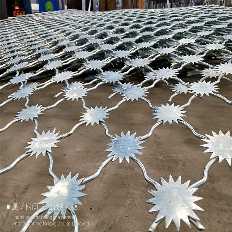 梅花刺網又稱監獄護欄網或監獄隔離柵,主要是采用高強度的刀片刺網與普通防護網的結合,由V型支架立拄,加強型焊接片網,安全防盜連接件和刀片刺網組成.刀片刺網是一種新型防護網,由銳利尖角鍍鋅鋼板或不銹鋼薄板做刀片,鋼絲做芯線組合而成的防護器材梅花刺網又稱高安全防護網、監獄防護網,是用氬弧焊將梅花形刺片焊接在美格網的節點上,形成刺形保護,有效的防止了手握腳攀,為此該鋼網墻在監獄或看守所使用。