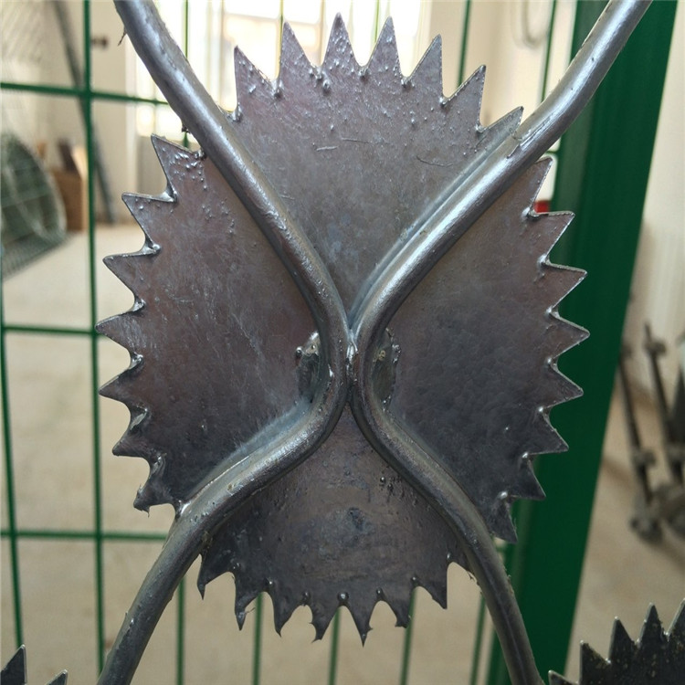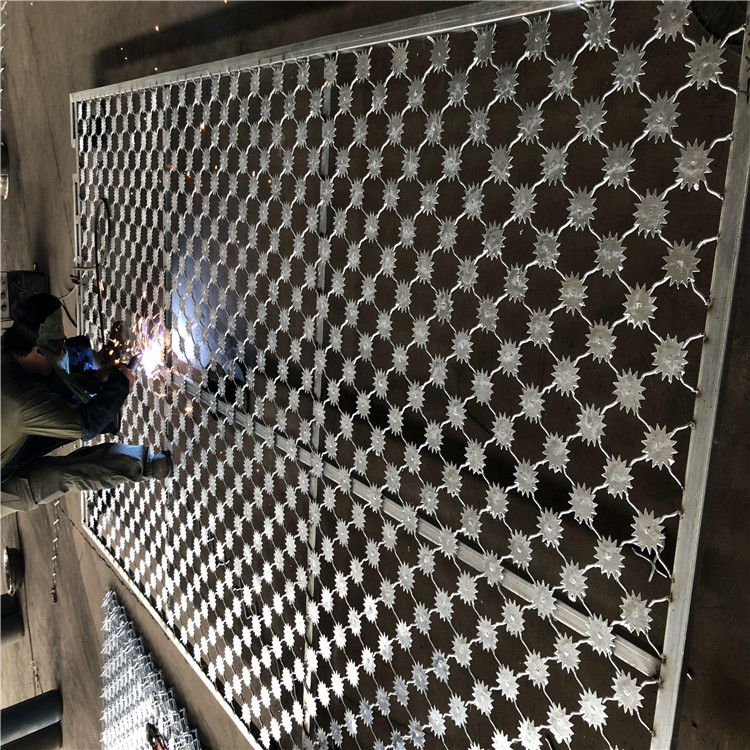 監獄帶剌的隔離網網片、立柱要求整體熱鍍鋅,上鋅量不低于100克,可做霧化試驗(附檢測報告) ,護欄網整體鍍鋅在內陸自然環境下,鋅層要求使用不低于10年。監獄太陽花隔離網看守所梅花刺美格網護欄