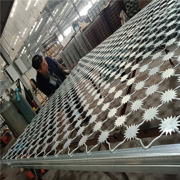 梅花刺片:梅花刺片直徑不小于7.5cm(直徑6cm、7cm、8cm),刺片厚1.5mm,采用Q235低碳鋼板沖壓成型。梅花刺片用氬弧焊將梅花形刺片焊接在美格網(wǎng)的節(jié)點(diǎn)上,形成刺形保護(hù),有效的防止了手握腳攀。