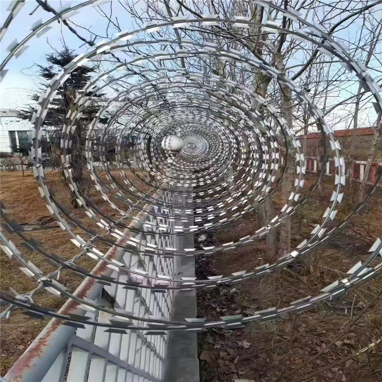 不銹鋼刀片刺繩可防盜色澤潔白發亮,鋅層厚、刀片分布均勻、刀片鋒利不易產品特點:生銹、牢固耐用低碳鋼絲、焊點抗拉力強、支撐力大抗拉力強、使用壽命長可廣泛用于許多學校、小區、家用、園林公寓、邊防。