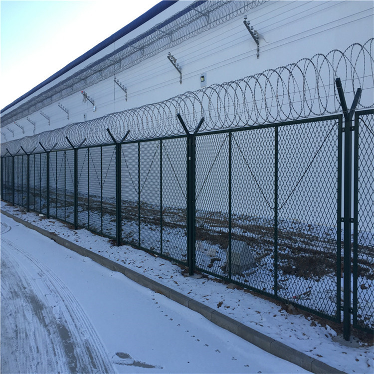 監獄鋼網墻是一種新型防護網,這種新型刀刺護欄網由蛇腹式刀刺網和焊接刀片刺網網片或有鋼絲焊接的網片組成。監獄隔離網可平地安裝,也可在圍墻上二次安裝,有效防止攀逃。直刺式刺網隔離帶,是用柱體和普通刺繩橫、縱、斜向交叉綁定成刺網隔離帶。主要用于特殊地帶、軍事基地圈護、溝壕圈護,安裝簡易,經濟耐用。 監獄護欄網又稱作“Y型安全防御護網”,是由V型支架立柱,加強型焊接片網,安全防盜連接件和熱鍍鋅刀片刺籠組成,強度和安全防御性級別很高。近年來,被廣泛應用在監獄,軍事基地等高安全場所。注:如果在監獄護欄網頂部加裝刀片刺絲、刀片刺繩后又很好的增強了安全防護性能。采用電鍍、熱鍍、噴塑、浸塑等防腐形式,具有很好的抗老化、抗曬、耐候等特點。其產品造型美觀、花色多樣,既起到圍欄作用,又起到美化作用。由于具有安全性高、防攀爬能力好,網片連接方式采用特制SBS緊扣件,有效防止人為的破壞性拆卸,橫向四道折彎加強筋,使網面強度顯著增加。