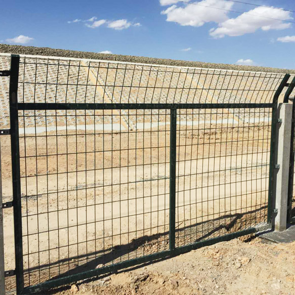 鋼筋混凝土立柱金屬網片防護柵欄可采用單開門或雙開門兩種形式。單開寬度1.5m,雙開寬度3m,其網片形式與防護柵欄保持一致,并通過銷鈾、銷鈾套與立柱連接。
