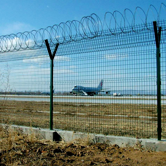 經常坐飛機的朋友,應該會注意過在機場外圍一圈綠色金屬絲編織或焊接的圍網,這就是我們經常說的機場圍界網,而我要給大家介紹的是一種我們公司近兩年研制的新型機場圍界產品 -- 鋁包鋼機場圍界