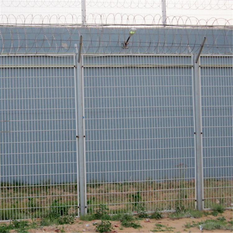 監(jiān)獄護(hù)欄網(wǎng)網(wǎng)孔:50*50,50mm*100mm,50mm*200mm或其它規(guī)格可定、網(wǎng)片中帶有V型加強(qiáng)筋,可大大增強(qiáng)圍網(wǎng)的防沖擊力、立柱為60*60的矩形鋼,頂端焊有V型之架。或者采用70mm*100mm的掛式連接立柱
